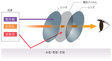 レンズの間に偏光フィルム(液晶ディスプレイにも使用される高品位なもの)を入れて反射光を抑えることができる高機能レンズ。