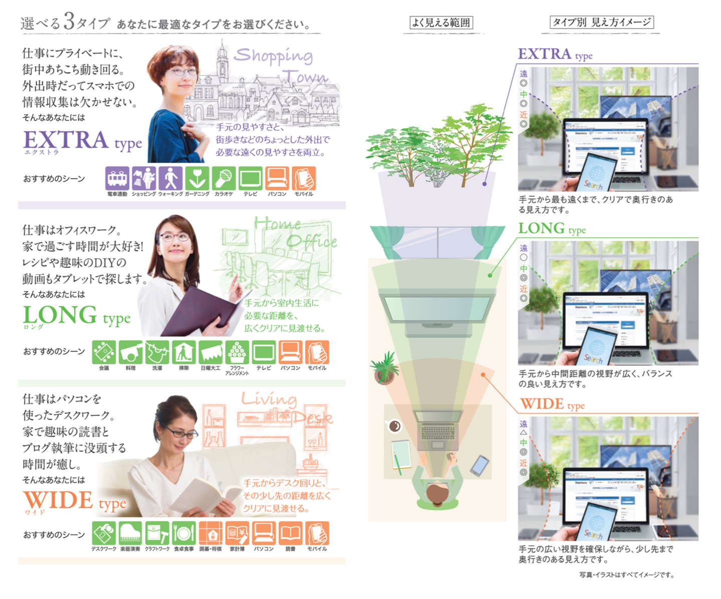 | タイプ | 遠方重視(EXTRA)・室内用(LONG)・手元重視(WIDE) | |||